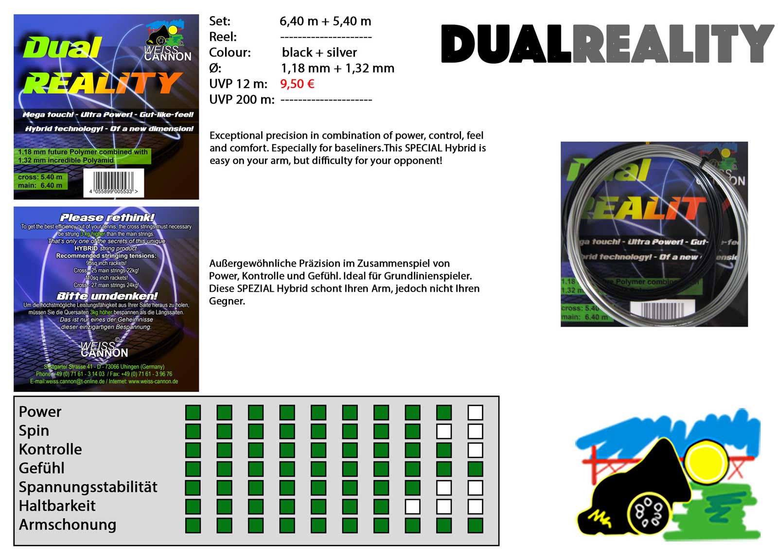 Odličen hibrid Wiess Cannon Dual Reality, je izdelan na podlagi nove poliestrske strune. Posebej za ta izdelek so razvili novo poliestrsko sestavo, ki so jo poimenovali kot "polimer prihodnosti". Za prečno struno so uporabili sintetično struno, ki je bila ravno tako izdelana posebej za ta hibrid, da bi tako lahko ponudili najboljšo možno kombinacijo moči in občutka.